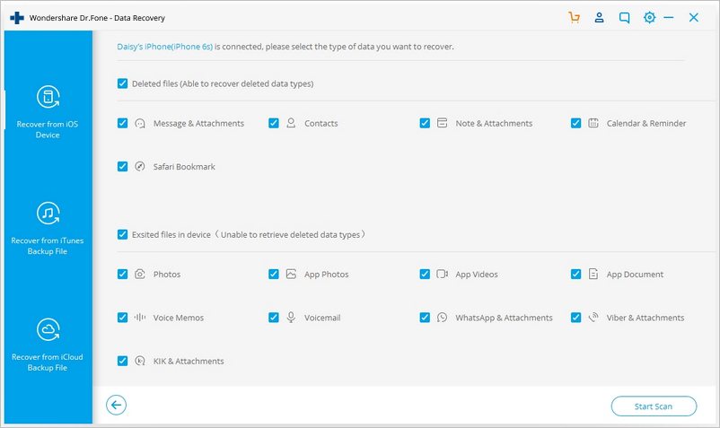 스캔하는데 시간이 좀 걸립니다.완료되면 프로그램에서 생성된 스캔 결과를 볼 수 있습니다. 장치에서 손실된 데이터와 존재하는 데이터는 범주 별로 표시됩니다. iOS 기기에서 삭제된 데이터를 필터링하려면 "삭제된 항목만 표시" 옵션을 ON으로 스와이프하면 됩니다.왼쪽에서 파일형식을 클릭하면 찾은 데이터를 미리 볼 수 있습니다. 오른쪽 상단에 검색 창이 있음을 볼 수 있습니다. 검색 창에 키워드를 입력하여 특정파일을 검색할 수 있습니다. 그런 다음 복구버튼을 클릭하여 데이터를 컴퓨터 또는 장치에 저장하십시오.